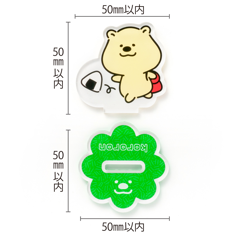 商品名 アクリルスタンド オリジナル形状(両面印刷タイプ)W50×H50mm以内 本体素材 透明アクリル3mm厚 本体サイズ オリジナル輪郭カット W50×H50mm以内 本体印刷色 両面フルカラー印刷+白押さえ 本体印刷色方法 UVインクジェット印刷 包装 OPP袋入 テンプレート ダウンロード 納期 【通常納期】