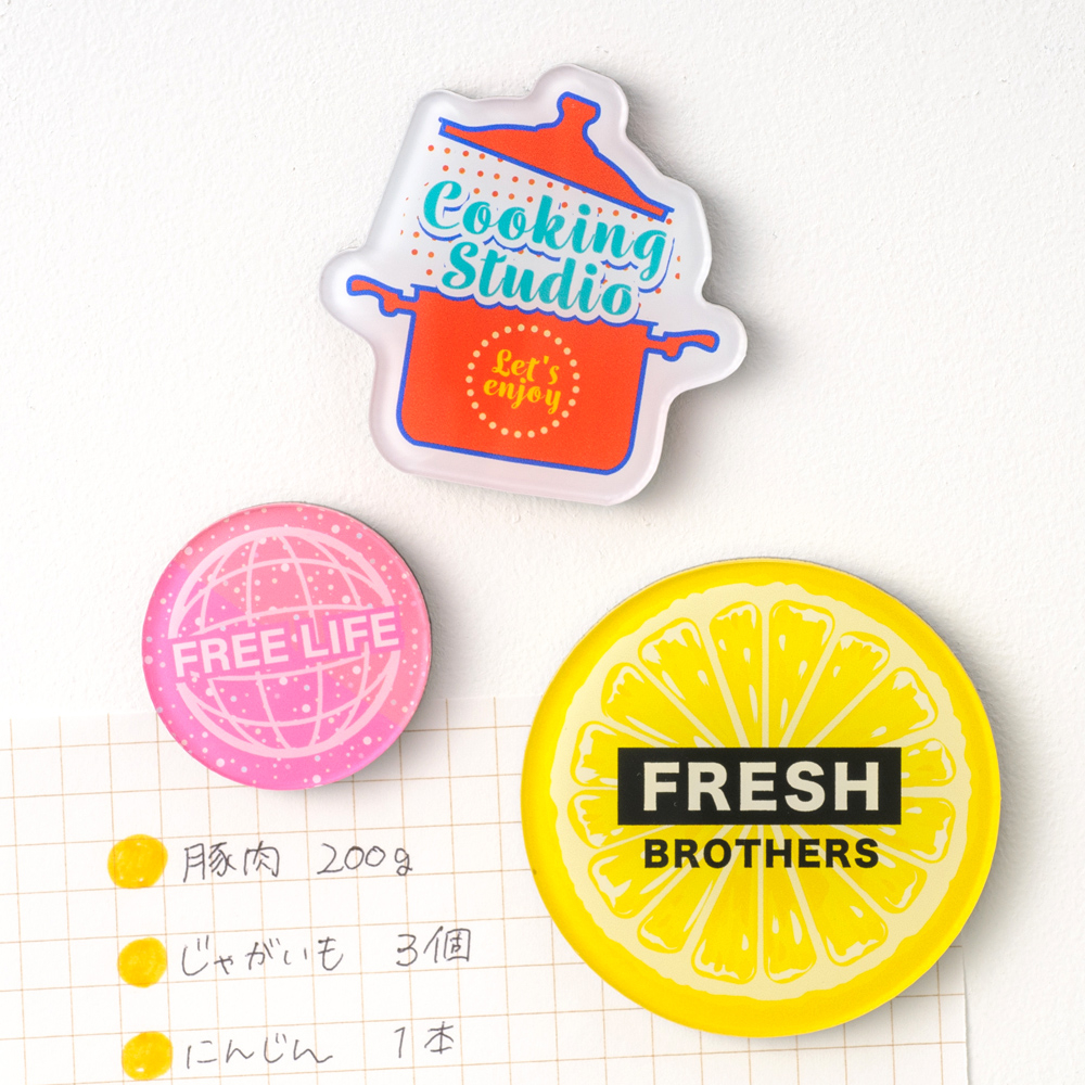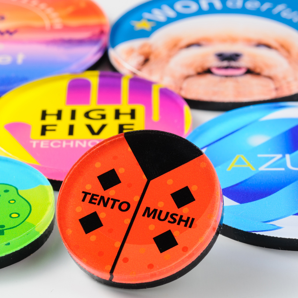 デザイン映え抜群、コイン風の丸型アクリルマグネットグッズ。