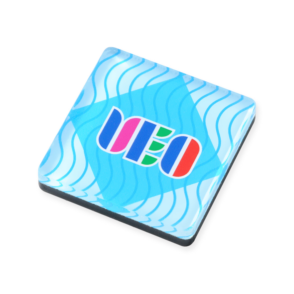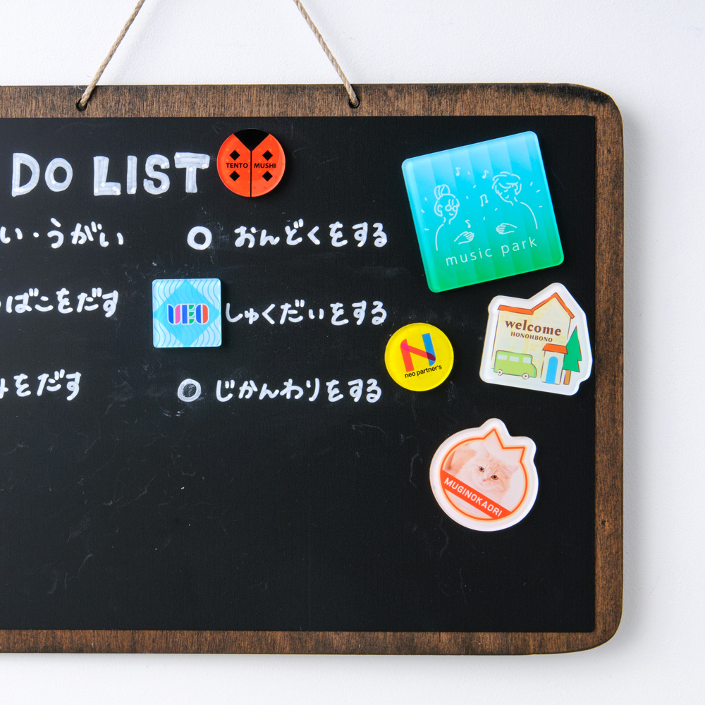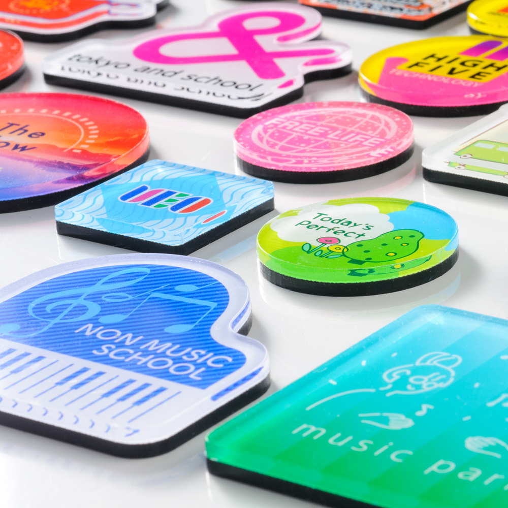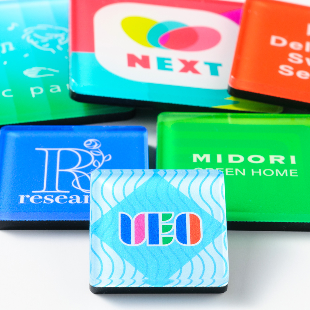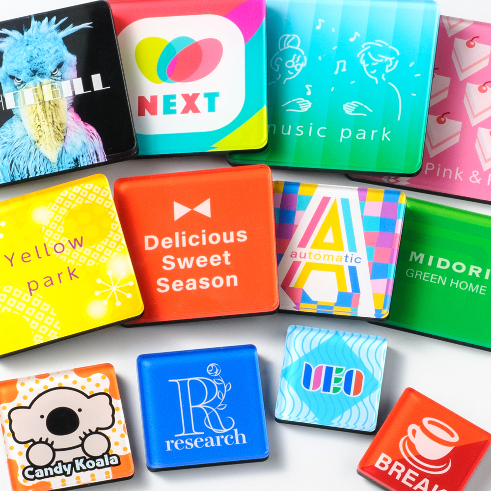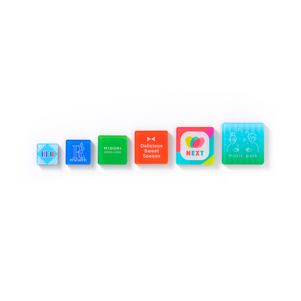 冷蔵庫やスチールラック、ホワイトボードなどに並べて貼っておける、ミニサイズのスクエア型マグネット。白押さえを施したフルカラー印刷で、ロゴや社名を美しくプリントします。アクリルのクリアな光沢も印象的。