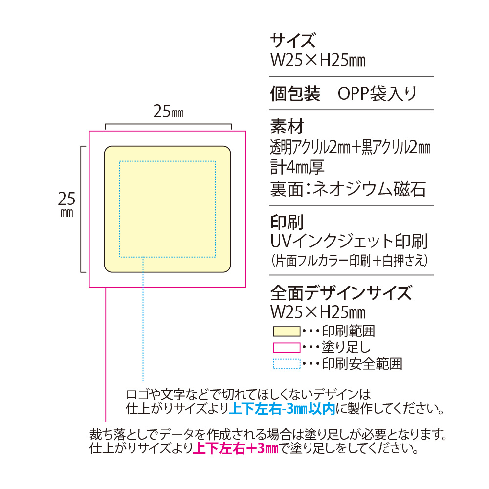 商品名 アクリルマグネット 四角タイプ W25×H25mm 本体素材 透明アクリル2mm+黒アクリル2mm厚,計4mm厚