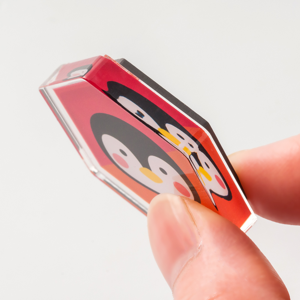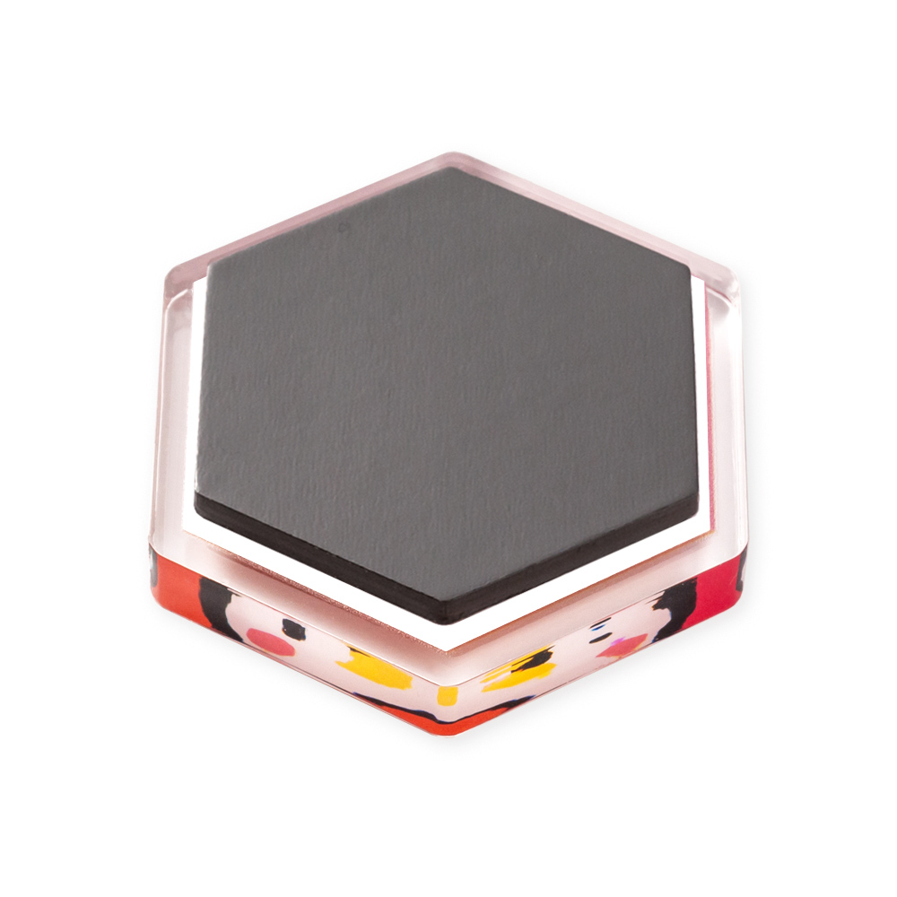 厚みのあるアクリルで作られた六角形マグネットは、透明感と高級感が魅力。フルカラー印刷でデザインを鮮明に表現でき、複数集めて並べればパズル感覚でも楽しめます。コレクショングッズや物販アイテムにおすすめです。