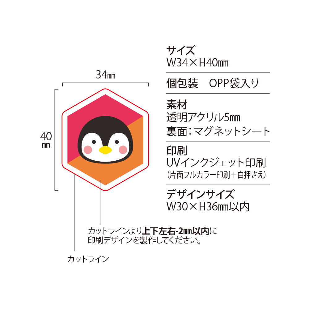 商品名 アクリルマグネット 六角形タイプ W34×H40mm 本体素材 透明アクリル5mm厚