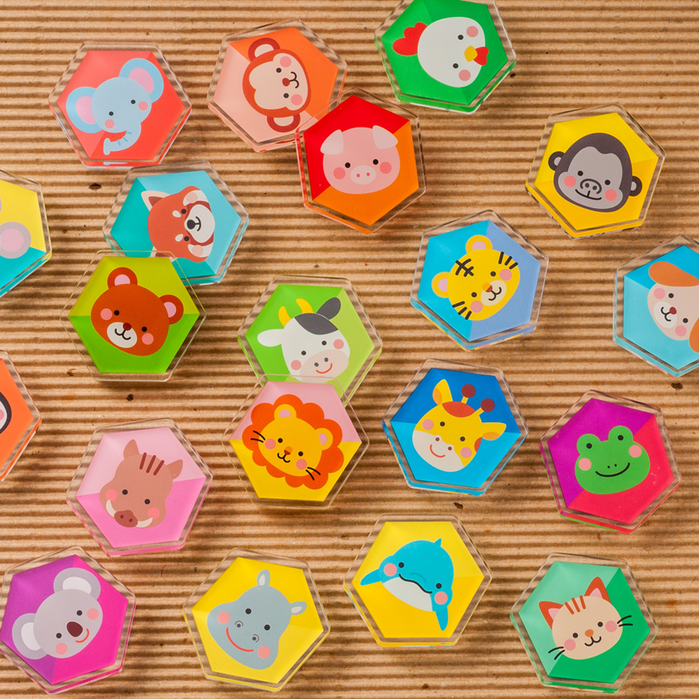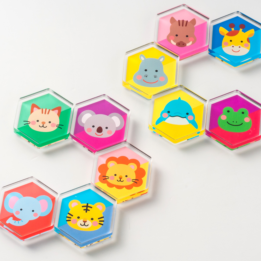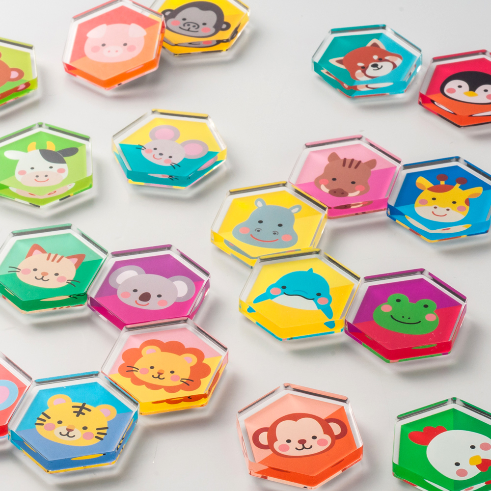 集めて並べて楽しめる六角形アクリルマグネット。透明感ある仕上がりで、ファングッズや販売用に最適です。