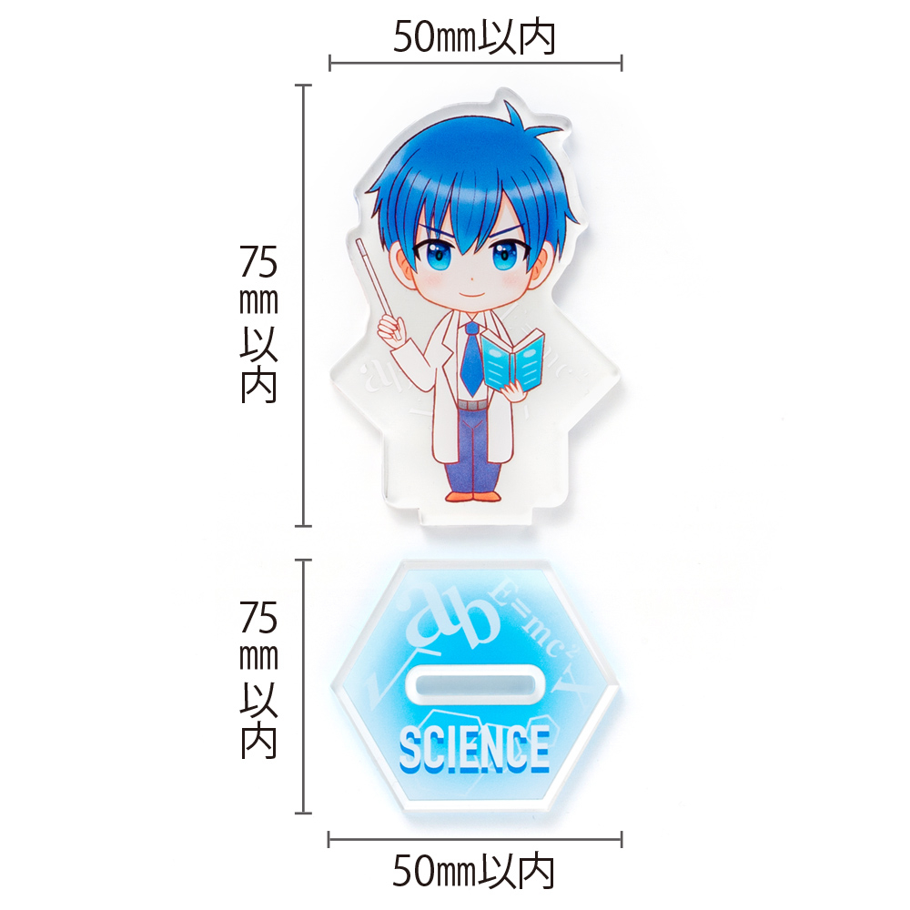 商品名 アクリルスタンド オリジナル形状(片面印刷タイプ)W50×H75mm以内 本体素材 透明アクリル3mm厚 本体サイズ オリジナル輪郭カット W50×H75mm以内 本体印刷色 片面フルカラー印刷+白押さえ 本体印刷色方法 UVインクジェット印刷 包装 OPP袋入 テンプレート ダウンロード 納期 【通常納期】