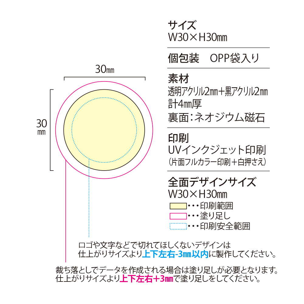商品名 アクリルマグネット 丸形タイプ W30×H30mm 本体素材 透明アクリル2mm+黒アクリル2mm厚,計4mm厚