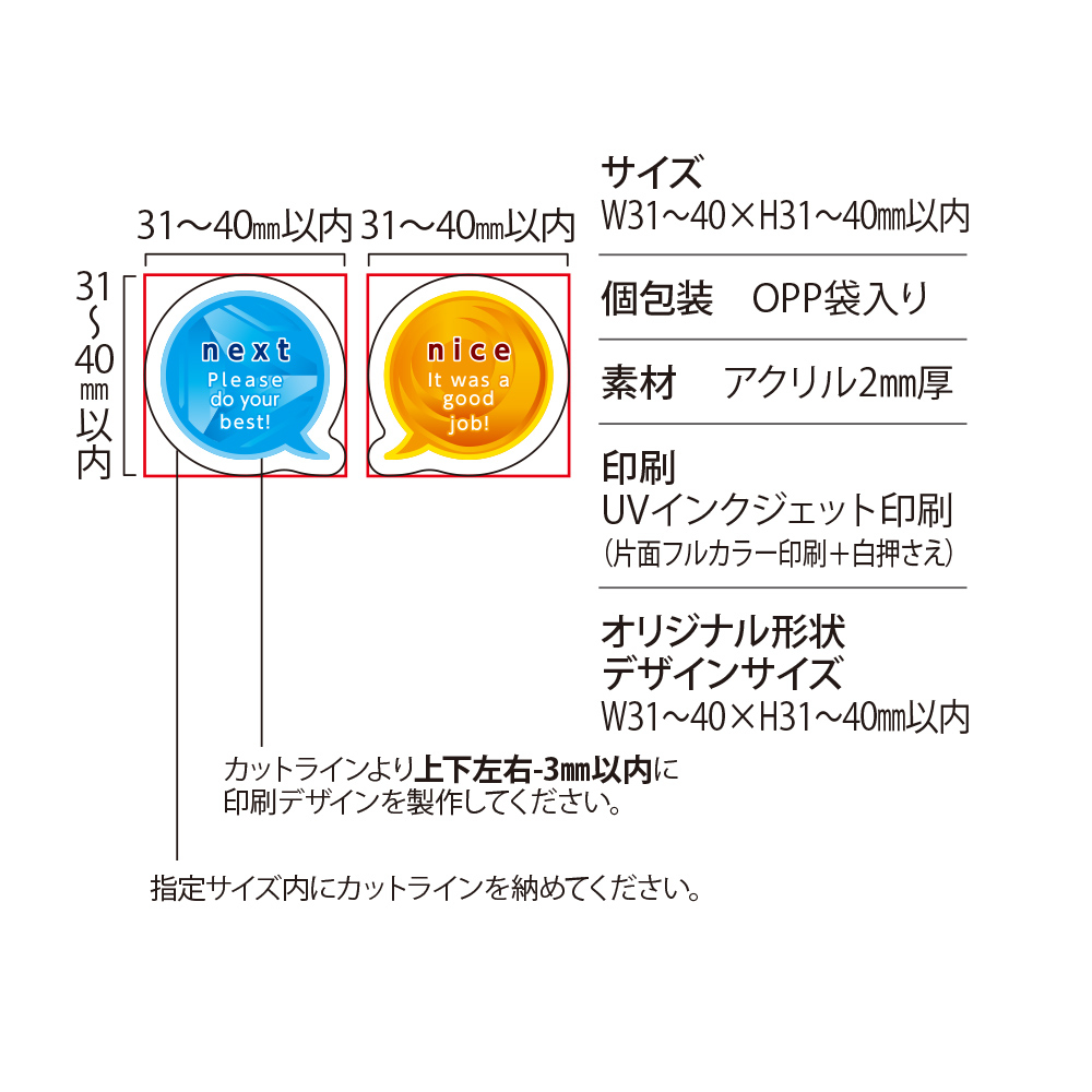 商品名 アクリルクリップ オリジナル形状(両面タイプ)W31~40×H31~40mm以内 本体素材 透明アクリル2mm厚x2枚 本体サイズ オリジナル輪郭カット W31~40×H31~40mm以内 本体印刷色 片面フルカラー印刷+白押さえ 本体印刷色方法 UVインクジェット印刷 包装 OPP袋入 テンプレート ダウンロード 納期 【通常納期】
