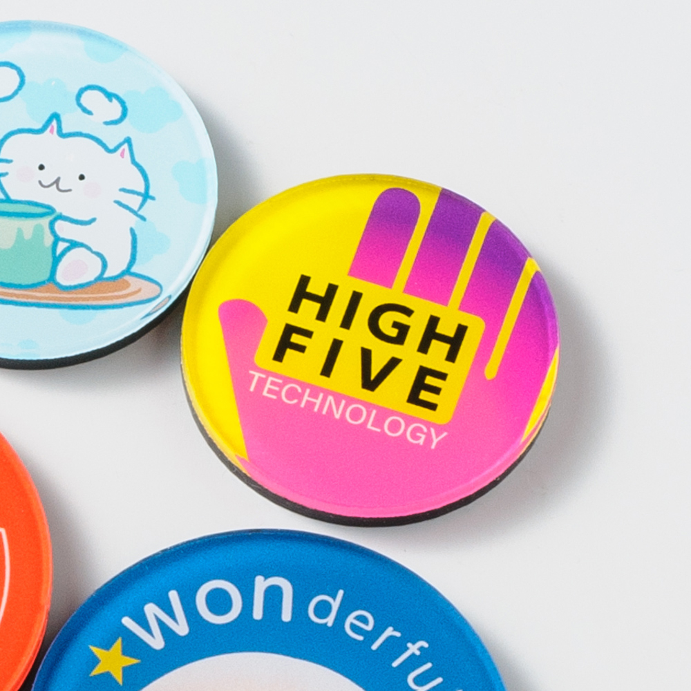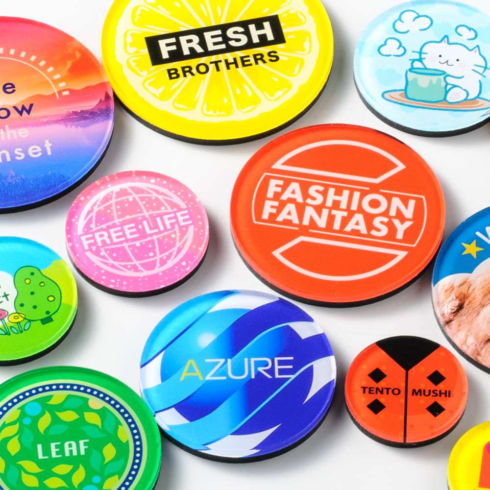 デザイン違いで並べても可愛い、35mmサイズのマグネット。アクリルのツヤめきが存在感を高め、小さめでも社名やロゴをしっかりアピール。アクリルは印刷面のカバー力にも優れ、色剥げなどの劣化を防ぎます。