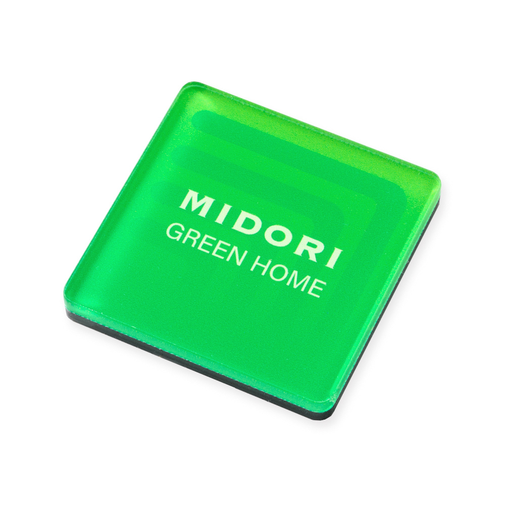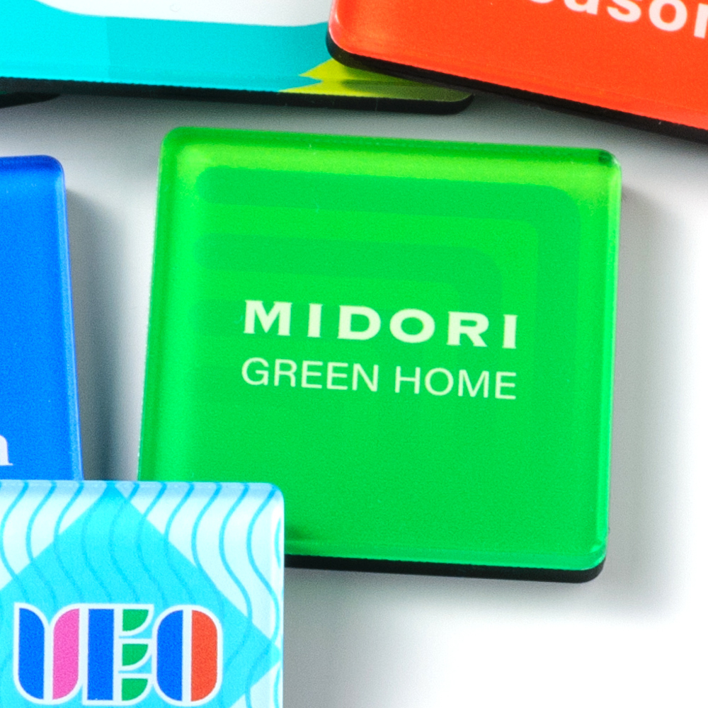 ほど良いサイズ感で使いやすい、スクエア型のマグネット。アクリルのツヤめきが美しく、白押さえで発色を高めたフルカラー印刷がロゴや社名を美しく引き立てます。イベントや営業時の配りやすさもポイントに。