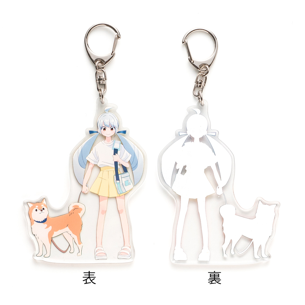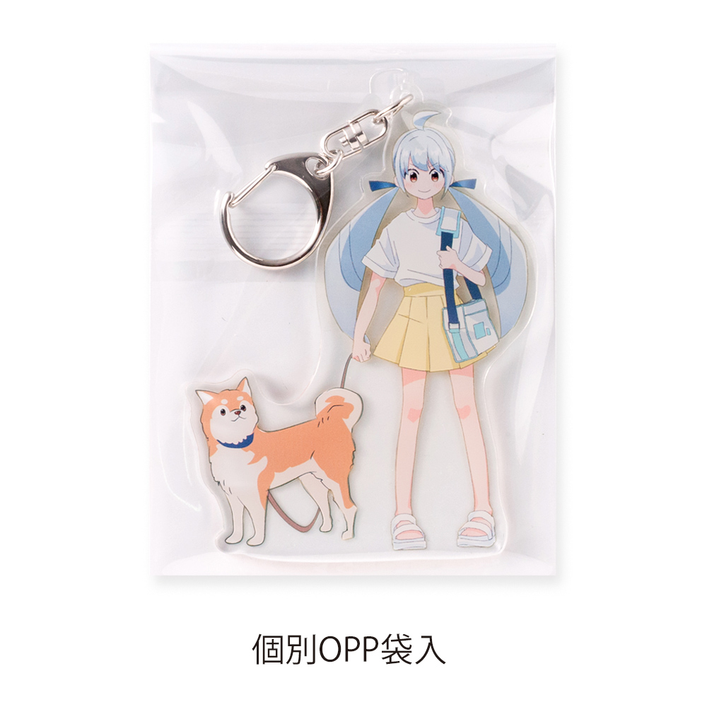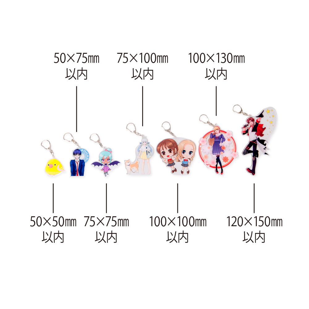 75×100mm以内自由カット。透明アクリルのクリア表現がデザインを引き立て、持ち歩くだけでアクセントに。ナスカン仕様でバッグチャームとしての使用にも適し、イベント物販や限定グッズに人気のサイズです。