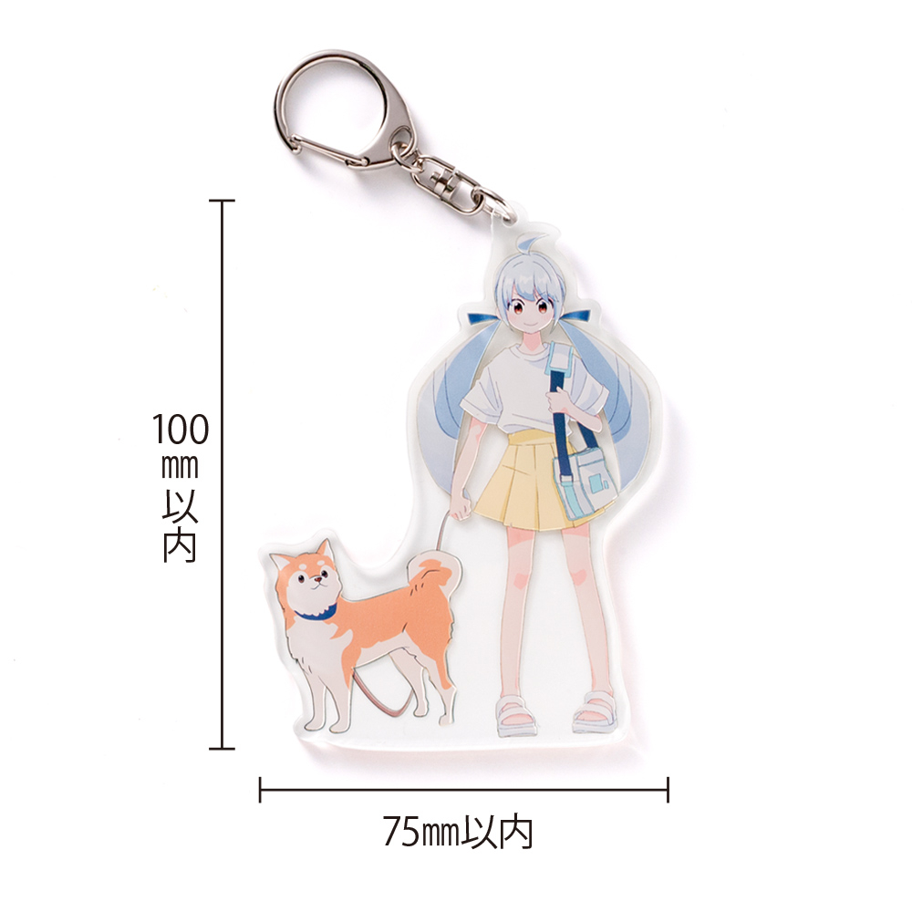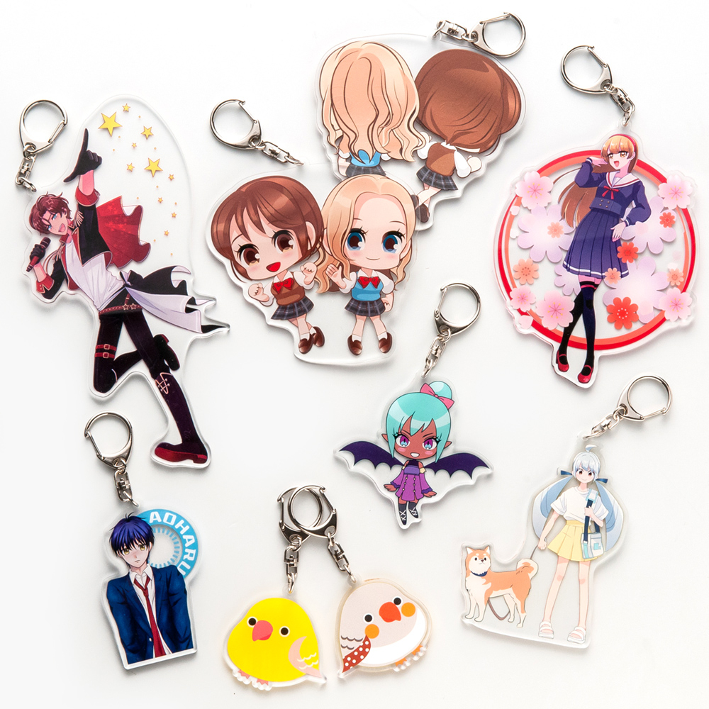 75×100mm以内で自由輪郭対応。両面フルカラー印刷により、表裏でデザイン違いや世界観構築が可能。透明アクリルの光沢と印刷表現がマッチし、イベント物販や限定ノベルティにも最適な存在感あるモデルです。