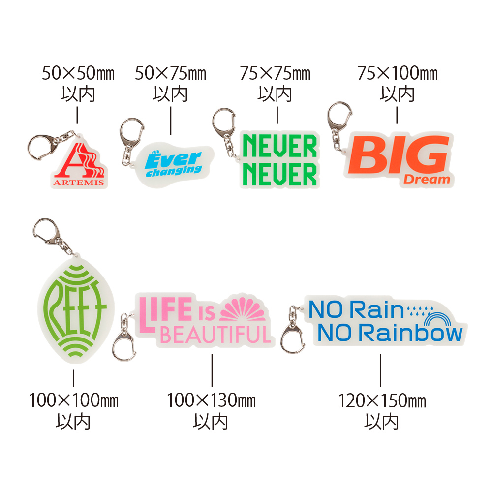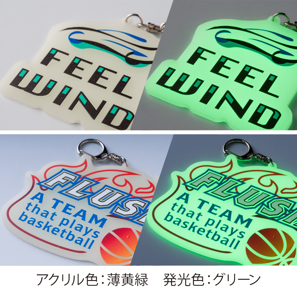 (アクリル色:薄黄緑,発光色:グリーン)本体サイズ オリジナル輪郭カット W75×H100mm以内 本体印刷色 片面フルカラー印刷+白押さえ 本体印刷色方法 UVインクジェット印刷 本体付属品 ナスカン付 包装 OPP袋入 テンプレート ダウンロード 納期 【通常納期】
