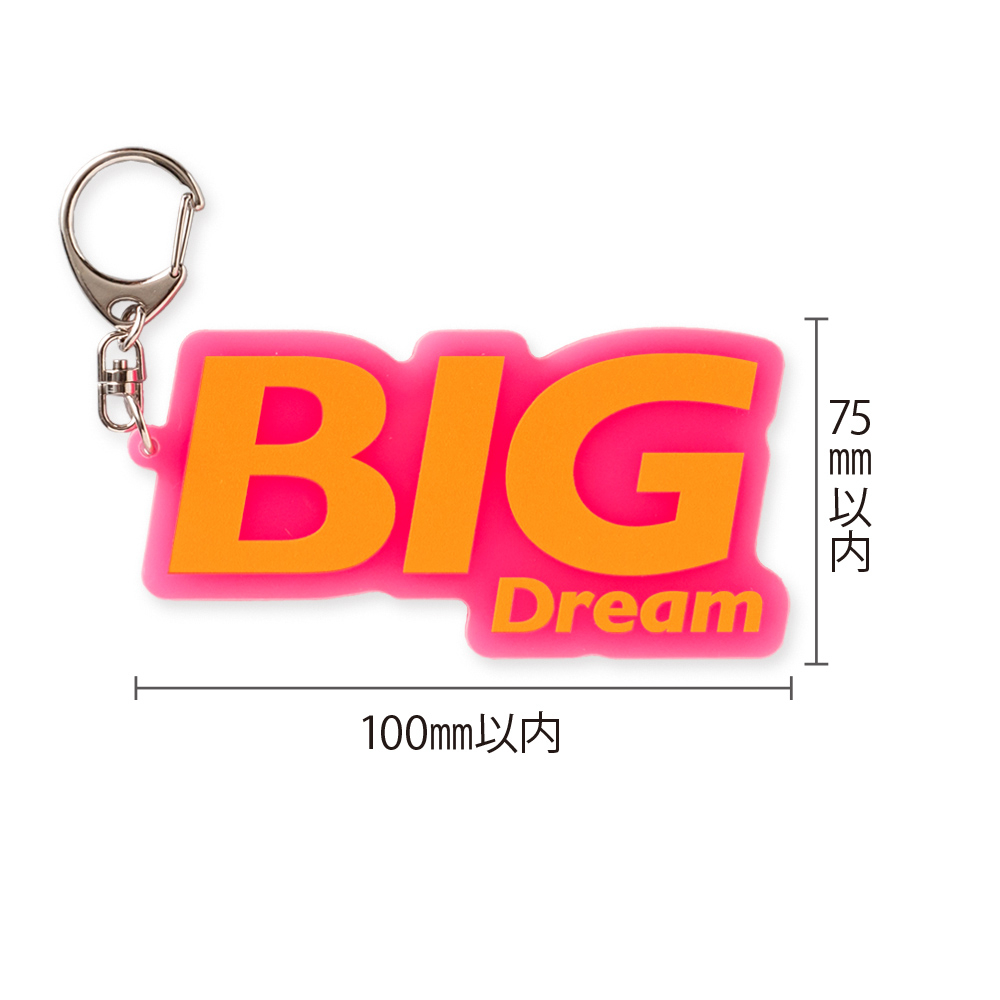 (アクリル色:ピンク,発光色:オレンジ)本体サイズ オリジナル輪郭カット W75×H100mm以内 本体印刷色 片面フルカラー印刷+白押さえ 本体印刷色方法 UVインクジェット印刷 本体付属品 ナスカン付 包装 OPP袋入 テンプレート ダウンロード 納期 【通常納期】