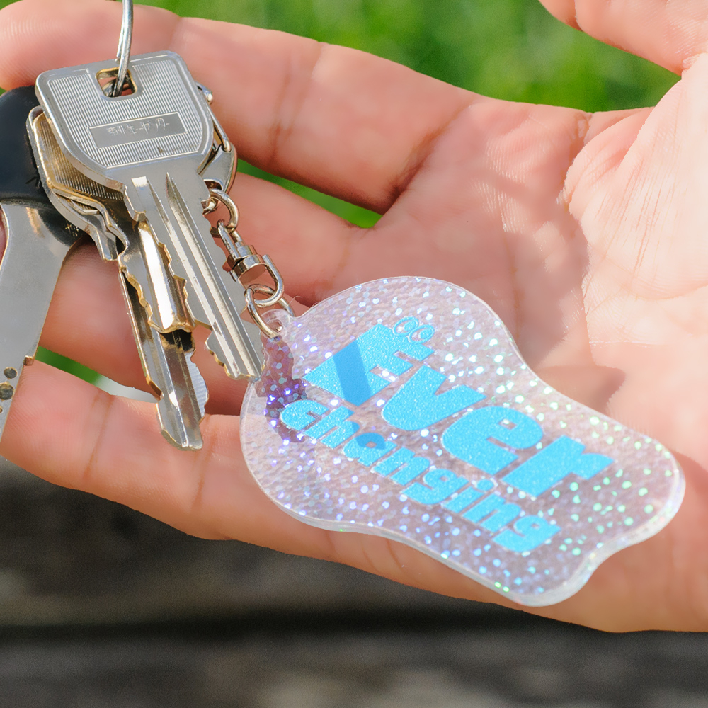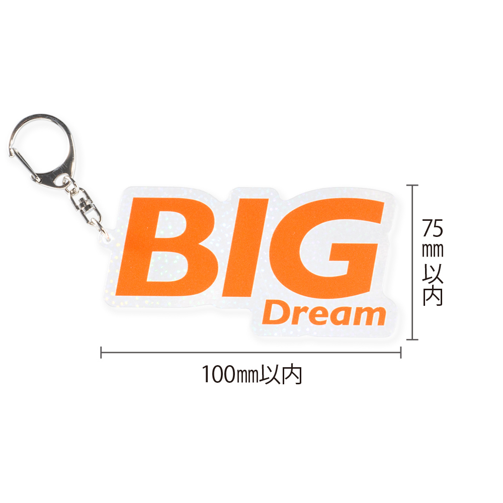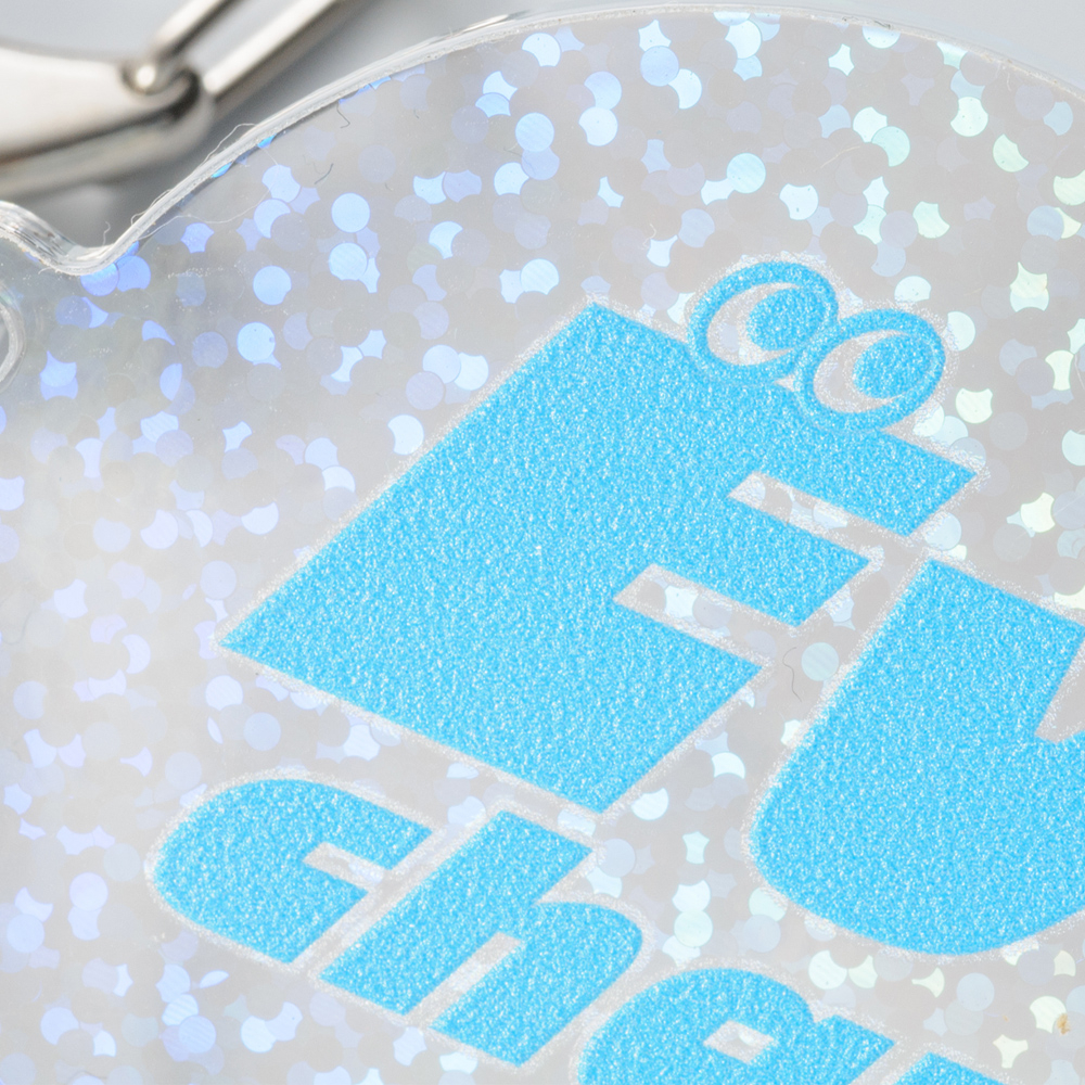 75×100mm以内で自由形状に対応。細かいホログラム柄が角度により異なる表情を見せ、透明度と輝きのバランスが上品。ナスカン仕様で使いやすく、イベント販売・限定グッズにぴったりの存在感あるサイズです。