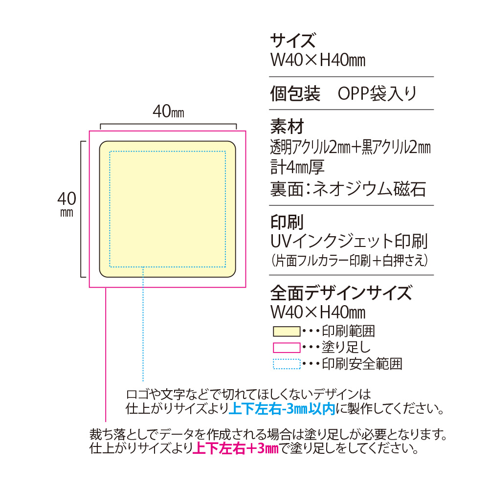 裏面:ネオジウム磁石本体サイズ W40×H40mm 本体印刷色 片面フルカラー印刷+白押さえ 本体印刷色方法 UVインクジェット印刷 本体付属品 ネオジウム磁石 包装 OPP袋入 テンプレート ダウンロード 納期 【通常納期】