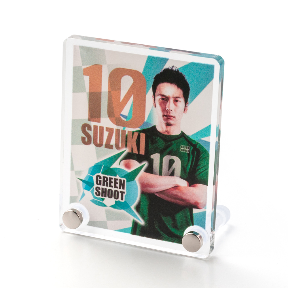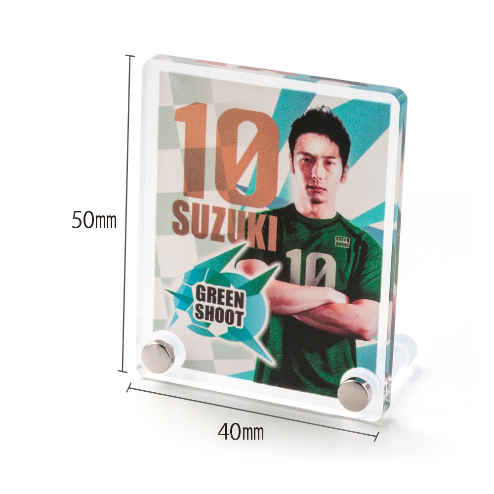 W40×H50㎜の縦長シルエット。人物写真やイラストにピッタリのバランスで、スタイリッシュに飾れるアイテムです。小さいながら存在感があり、推しグッズやイベント配布品にも◎。