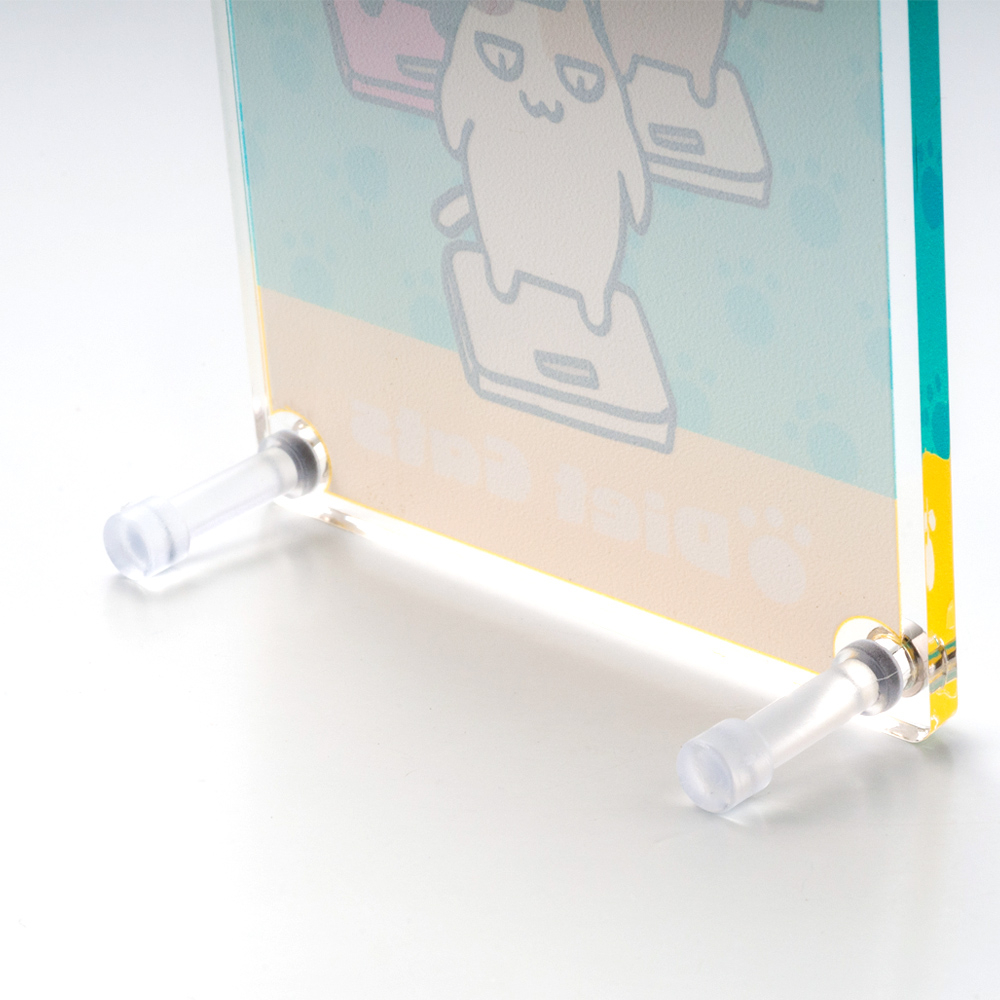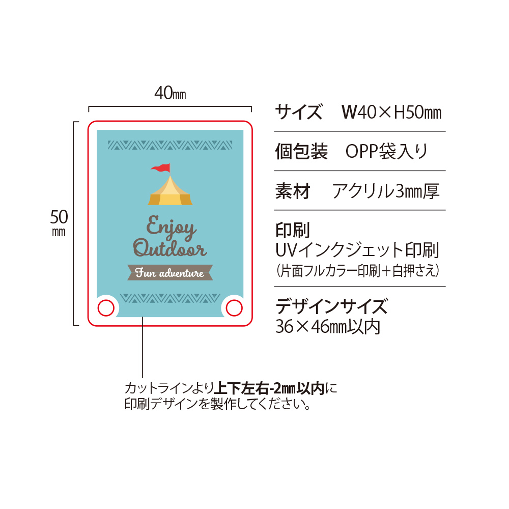 商品名 アクリルミニフォトスタンド W40×H50mm 本体素材 透明アクリル3mm厚 本体サイズ W40×H50mm 本体印刷色 片面フルカラー印刷+白押さえ 本体印刷色方法 UVインクジェット印刷 本体付属品 クリアスタンドパーツ2個(PVC),フロント金具2個(真鍮)付 包装 OPP袋入 テンプレート ダウンロード 納期 【通常納期】
