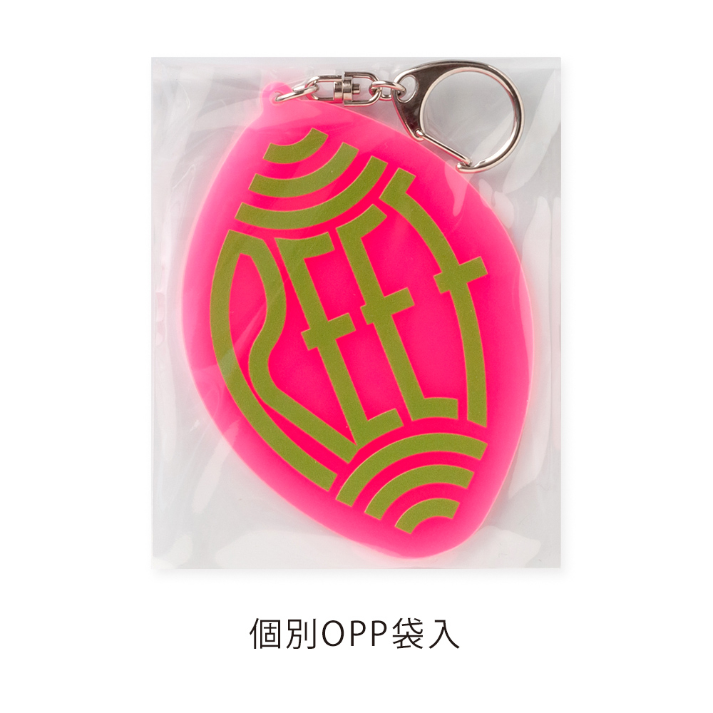 (アクリル色:ピンク,発光色:オレンジ)本体サイズ オリジナル輪郭カット W100×H100mm以内 本体印刷色 片面フルカラー印刷+白押さえ 本体印刷色方法 UVインクジェット印刷 本体付属品 ナスカン付 包装 OPP袋入 テンプレート ダウンロード 納期 【通常納期】