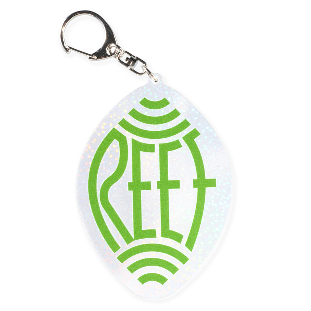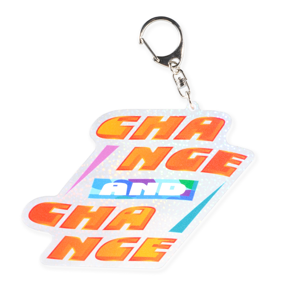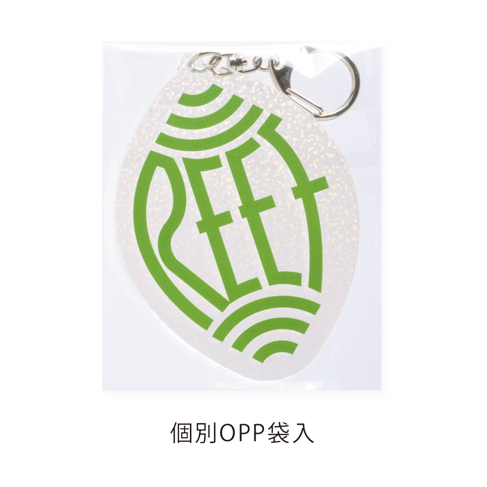 100×100mm以内対応。印刷されたデザインに加え、背景の細かいホログラムが光の反射で動きを演出し、見るたびに違う印象を楽しめます。ナスカン仕様で携帯性まで考慮され、展示・物販にも人気のサイズです。