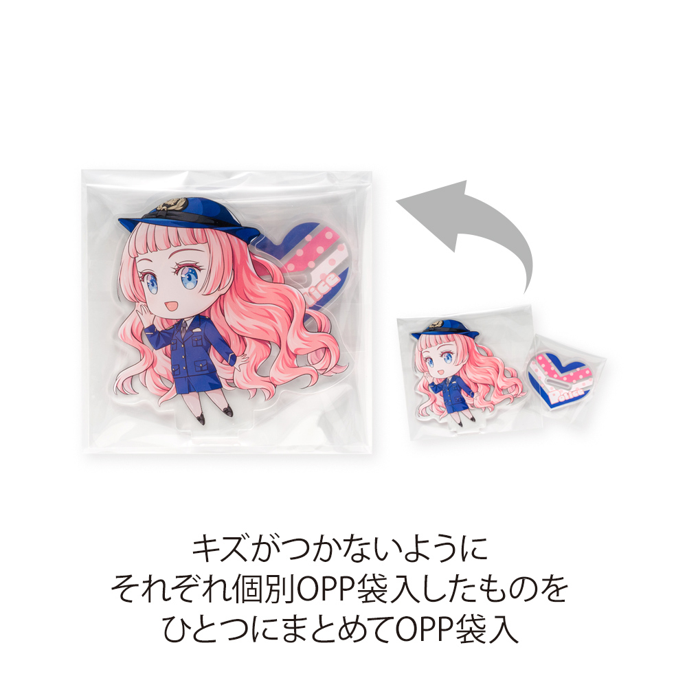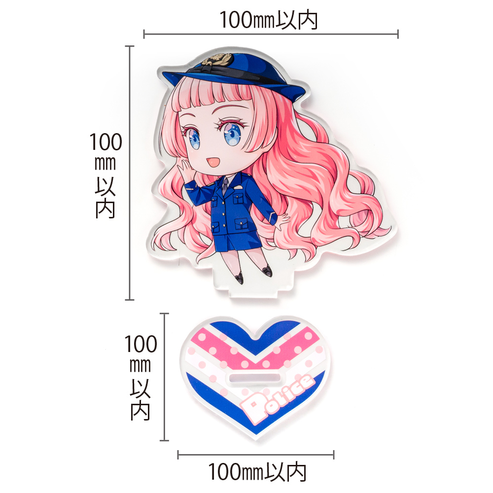 商品名 アクリルスタンド オリジナル形状(両面印刷タイプ)W100×H100mm以内 本体素材 透明アクリル3mm厚 本体サイズ オリジナル輪郭カット W100×H100mm以内 本体印刷色 両面フルカラー印刷+白押さえ 本体印刷色方法 UVインクジェット印刷 包装 OPP袋入 テンプレート ダウンロード 納期 【通常納期】
