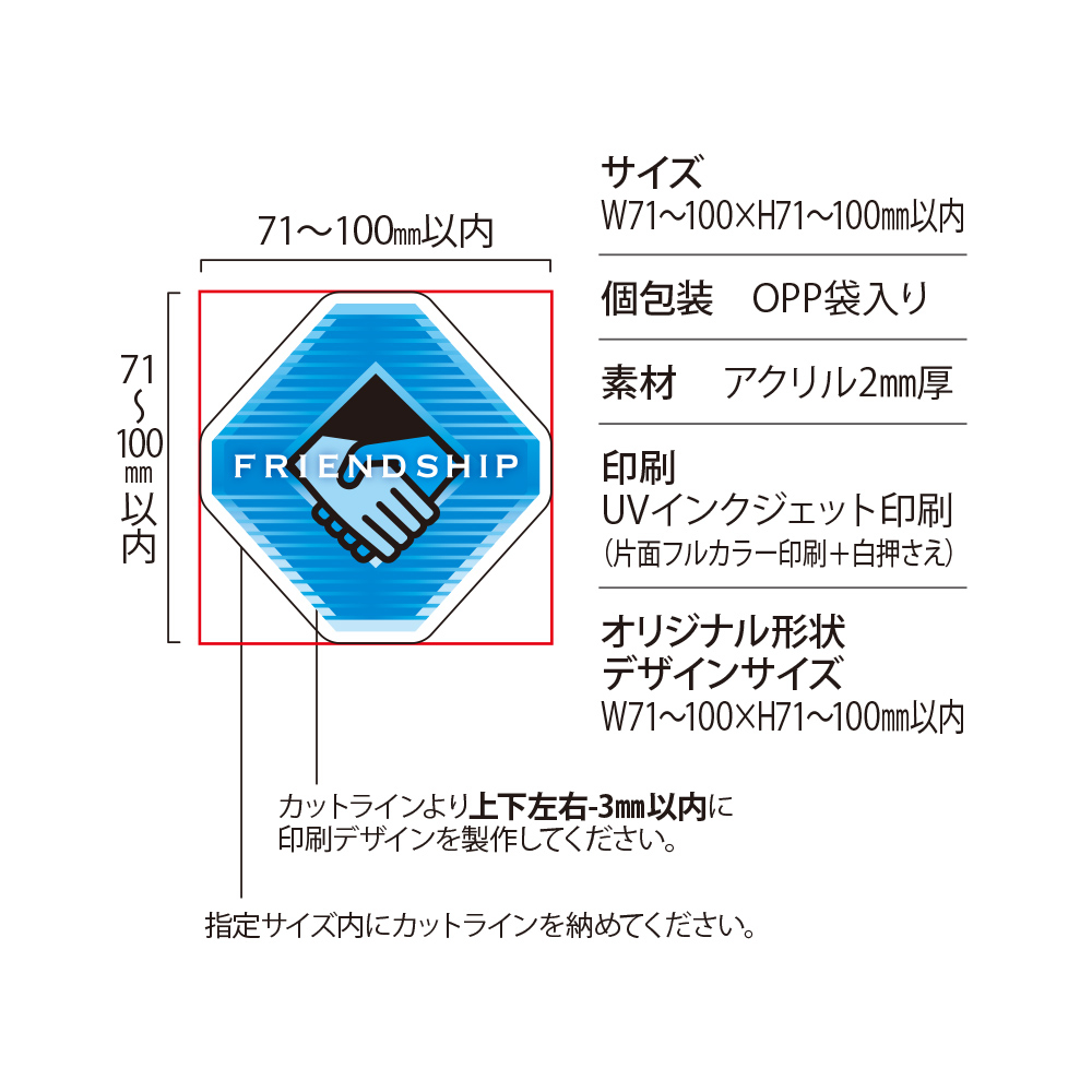 商品名 アクリルクリップ オリジナル形状(片面タイプ)W71~100×H71~100mm以内 本体素材 透明アクリル2mm厚 本体サイズ オリジナル輪郭カット W71~100×H71~100mm以内 本体印刷色 片面フルカラー印刷+白押さえ 本体印刷色方法 UVインクジェット印刷 本体付属品 クリップパーツ付 包装 OPP袋入 テンプレート ダウンロード 納期 【通常納期】