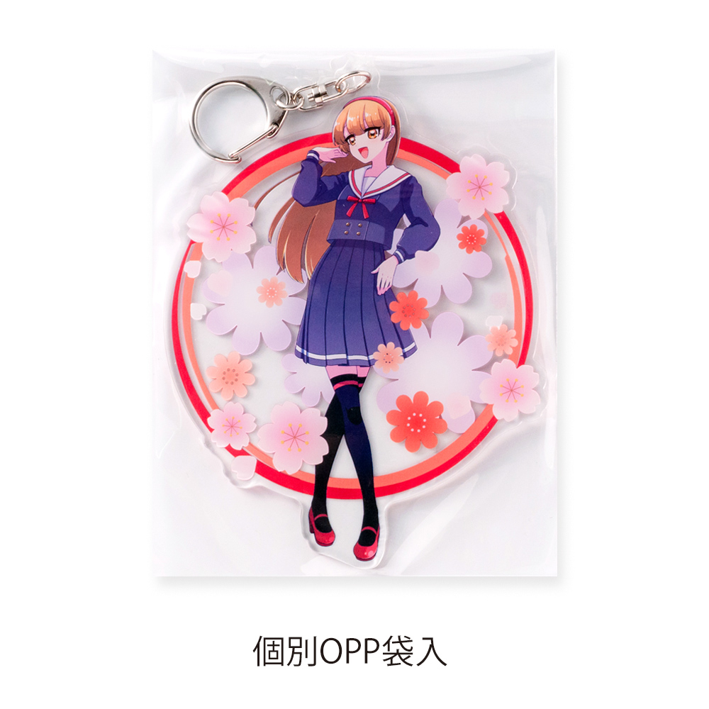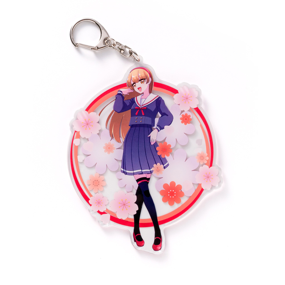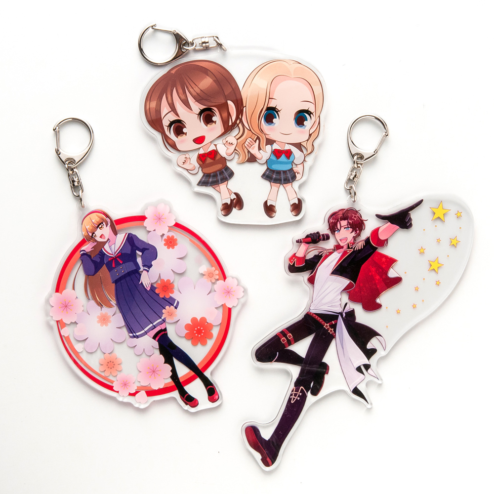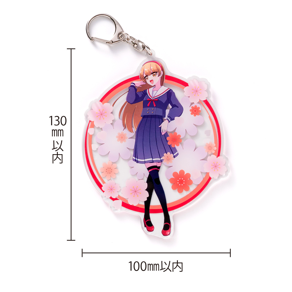 100×130mm以内形状カット対応。透明アクリル越しの両面印刷により、光の入り方で見え方が変わる立体的な表現が可能。ライブ・アニメ・キャラグッズ・限定販売品など、“魅せる”用途に最適な大判モデルです。