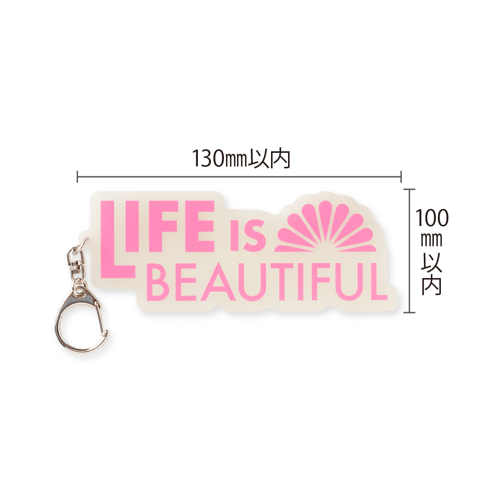 (アクリル色:薄黄緑,発光色:グリーン)本体サイズ オリジナル輪郭カット W100×H130mm以内 本体印刷色 片面フルカラー印刷+白押さえ 本体印刷色方法 UVインクジェット印刷 本体付属品 ナスカン付 包装 OPP袋入 テンプレート ダウンロード 納期 【通常納期】