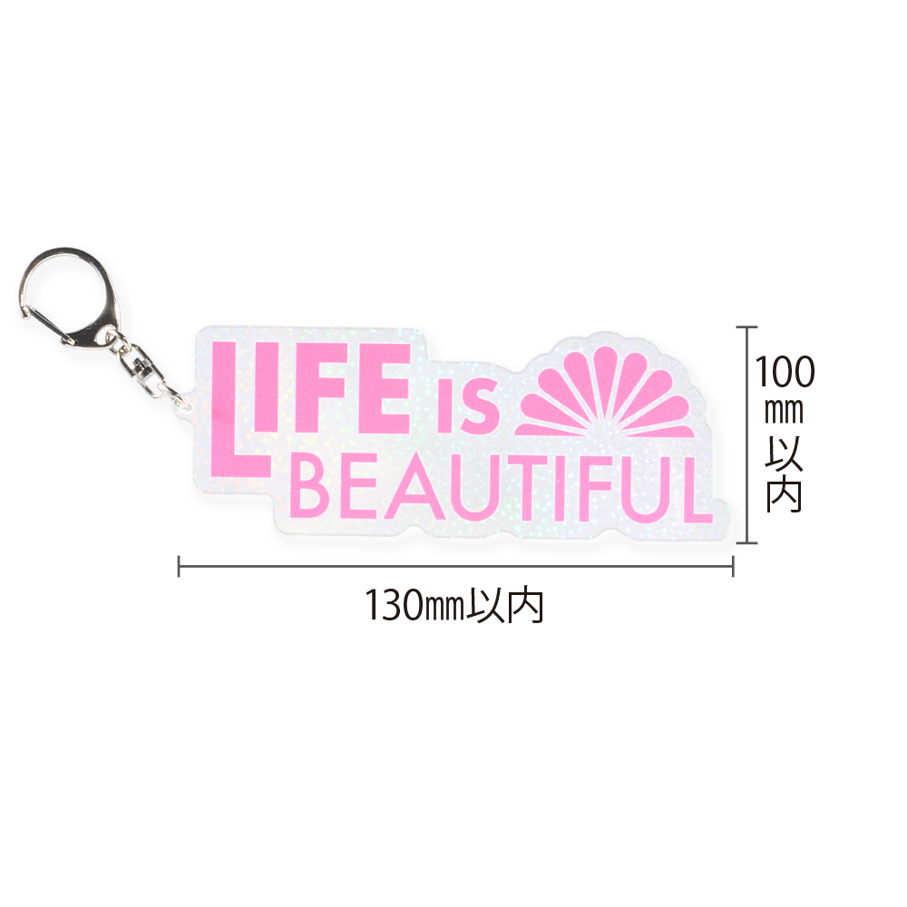 100×130mm以内自由カット可能。細かいホログラム素材が角度で輝きを変え、高級感ある仕上がりに。ナスカン仕様で使いやすく、限定販売モデルやライブ・イベント物販にもぴったりです。