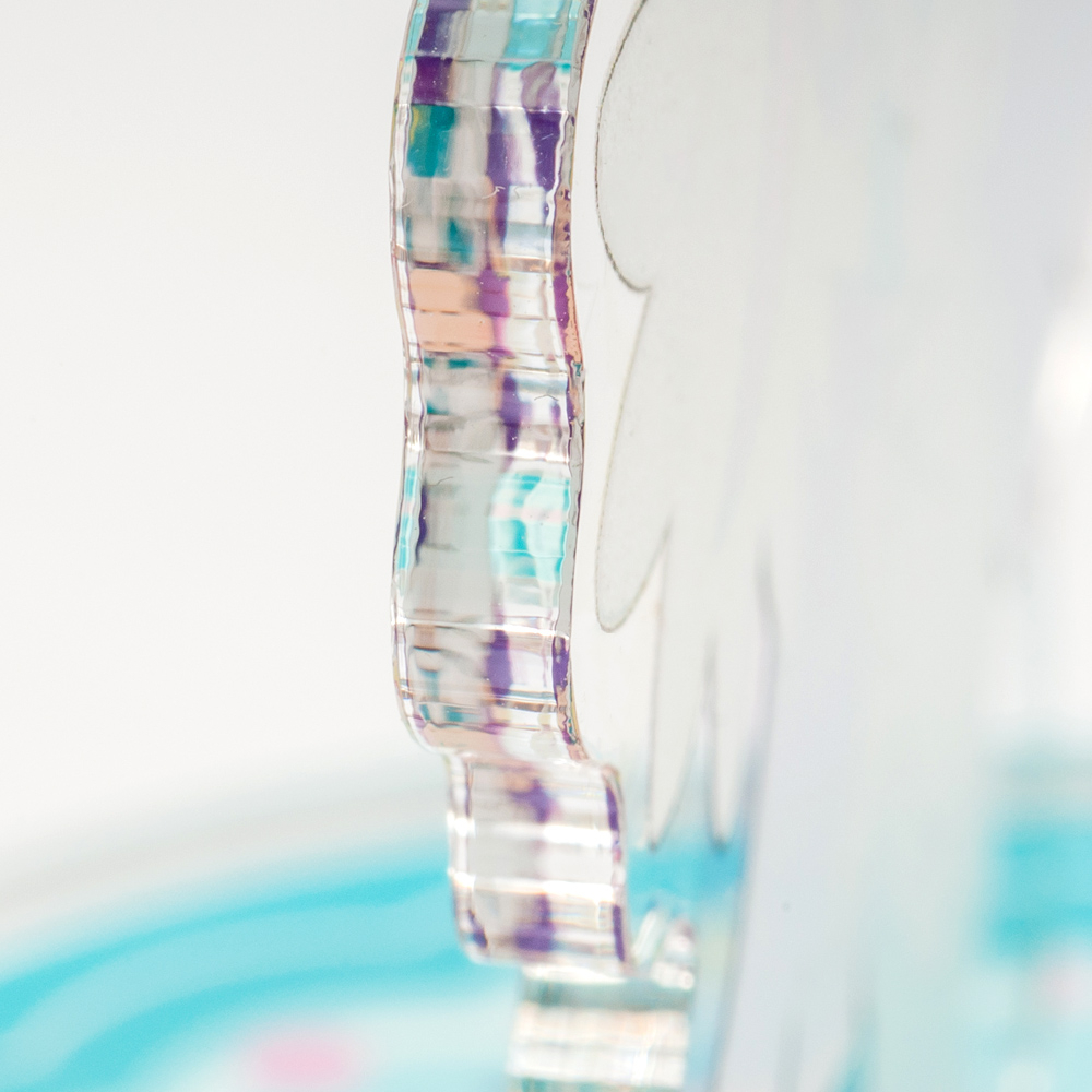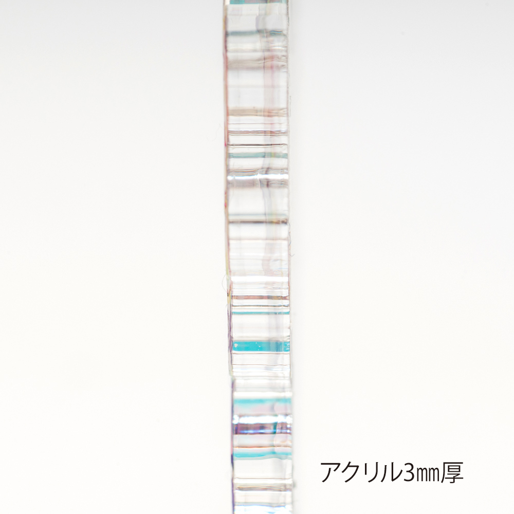 100×130mm以内自由カット対応。両面印刷により、背景・表情違い・裏設定など幅のある表現が可能。透明アクリルの抜け感とサイズ感で展示映えし、限定販売・プレミアムモデルとして人気です。