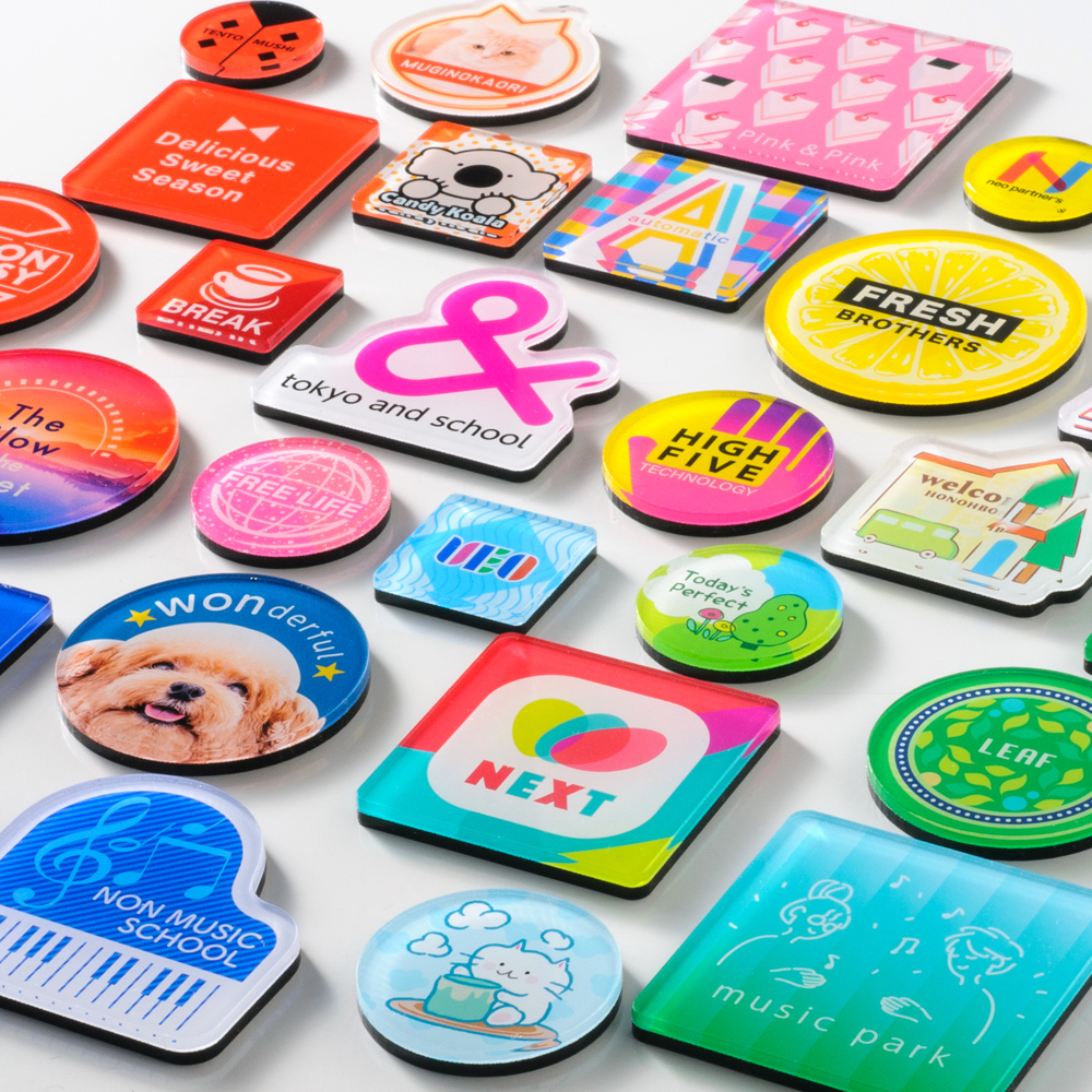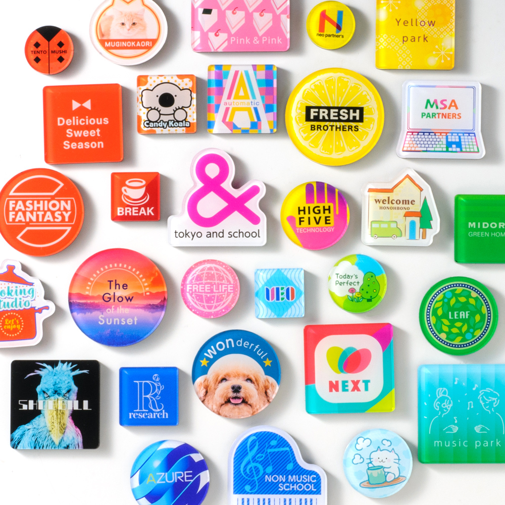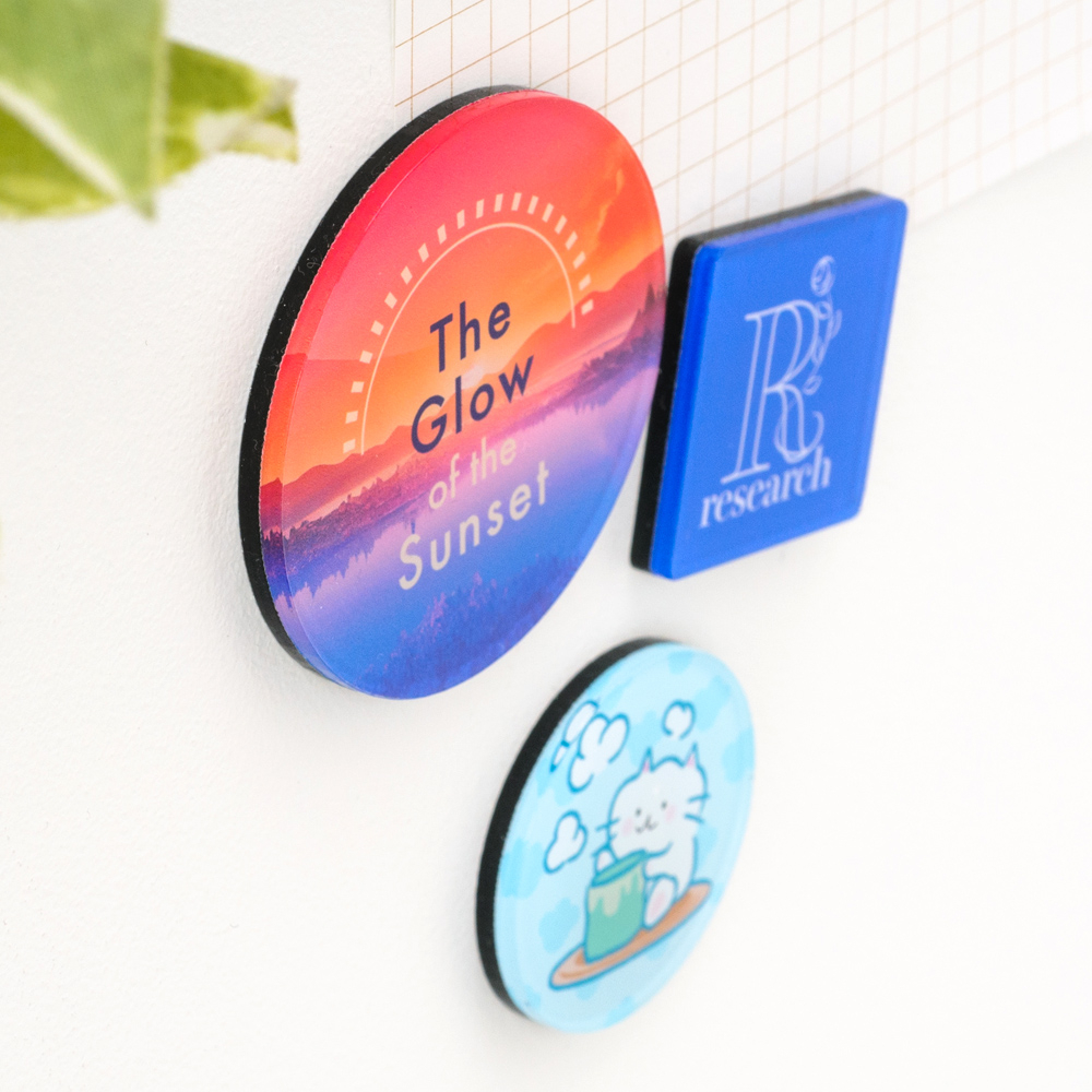 冷蔵庫やスチールラックなどに貼りつくマグネットは、手軽で製作時のコスパも良く、ノベルティの鉄板商品として広く親しまれています。ほどよいツヤ感をプラスする透明アクリルが、印刷面をしっかりカバーして劣化を防ぎます。