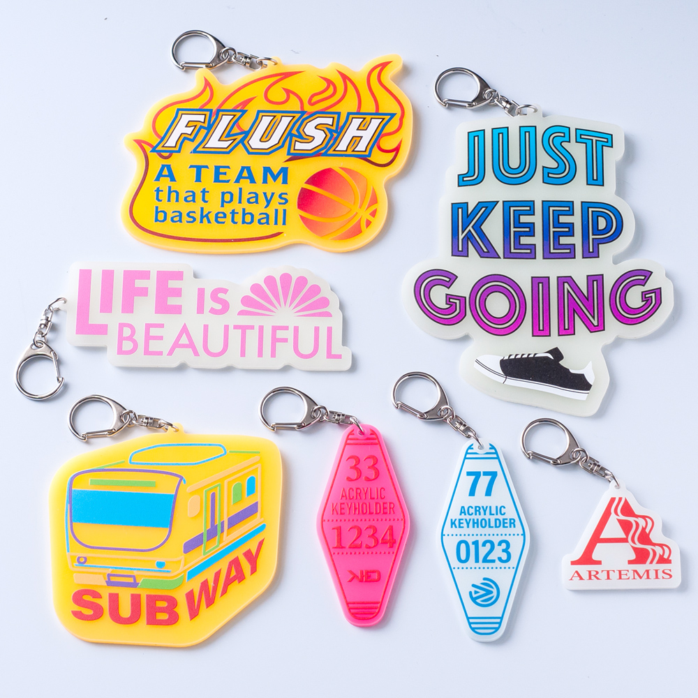 120×150mmまで対応のビッグサイズ。蓄光ブルーアクリルが夜間に発光し、視覚的効果と特別感を演出。展示用・限定販売・プレミアム仕様として人気。ナスカン付きで飾る・持ち歩く両方に対応します。