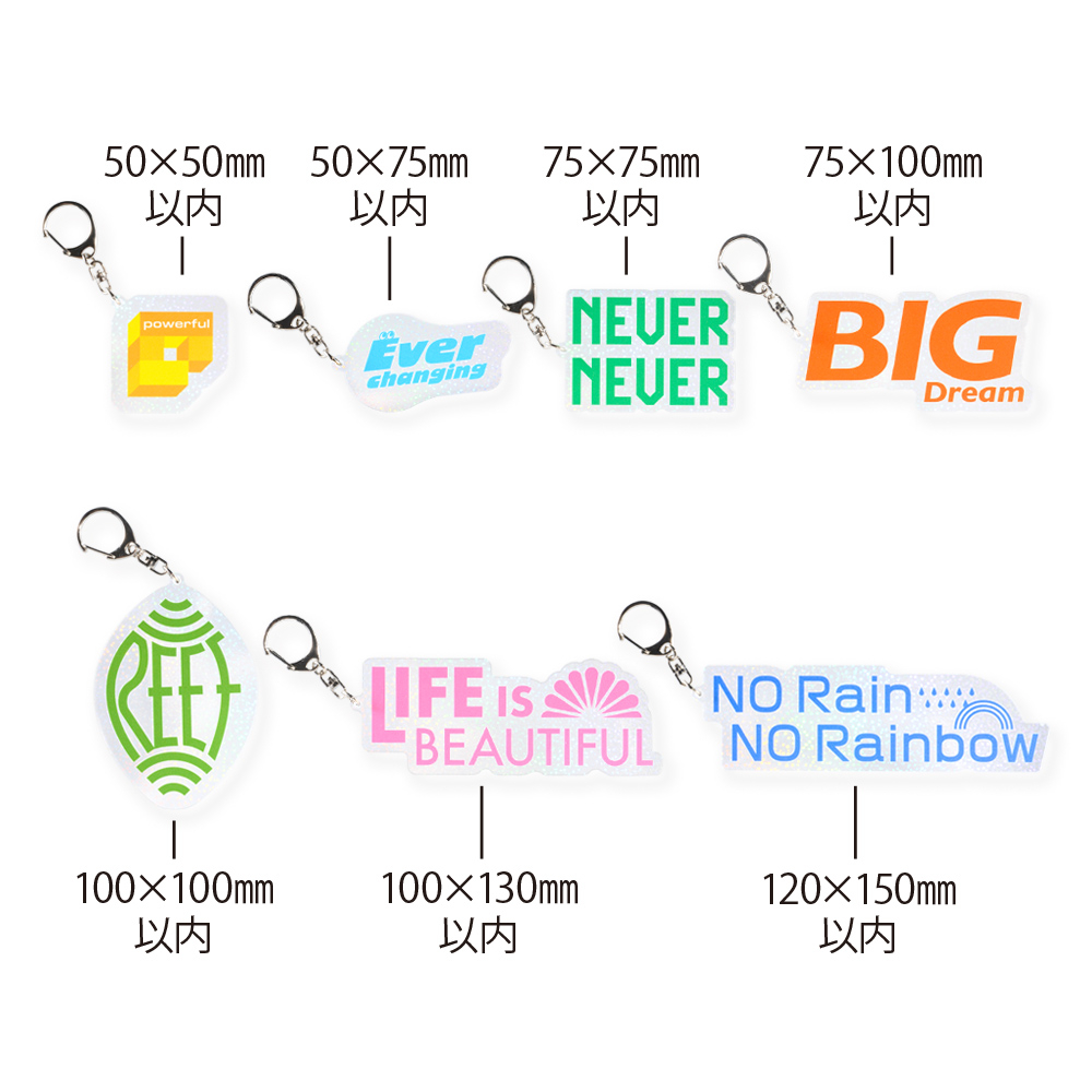 商品名 アクリルキーホルダー ナスカン オリジナル形状(ホログラム003タイプ)W120×H150mm以内 本体素材 ホログラムアクリル3mm厚 本体サイズ オリジナル輪郭カット W120×H150mm以内 本体印刷色 片面フルカラー印刷+白押さえ 本体印刷色方法 UVインクジェット印刷 本体付属品 ナスカン付 包装 OPP袋入 テンプレート ダウンロード 納期 【通常納期】